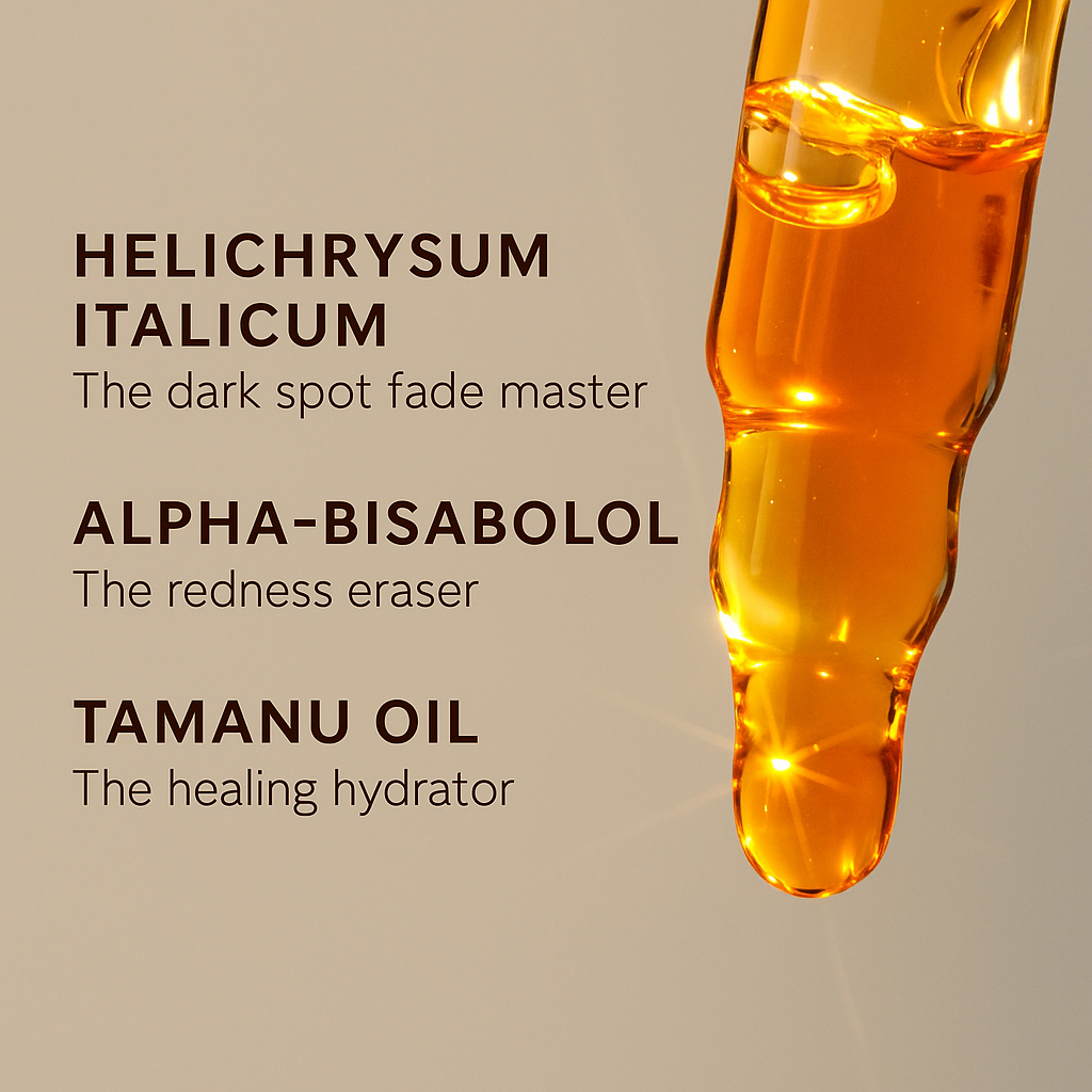 Helichrysum (Immortelle) ā Nicknamed āliquid goldā for its ability to renew, fade spots, and protect your barrier